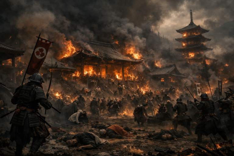 à sua autoridade. Em 1571, ele lançou um ataque devastador contra o Enryaku-ji no Monte Hiei, o coração do poder Sōhei da seita Tendai. O templo foi incendiado e milhares de monges, incluindo mulheres e crianças, foram massacrados, um evento que chocou o Japão.
