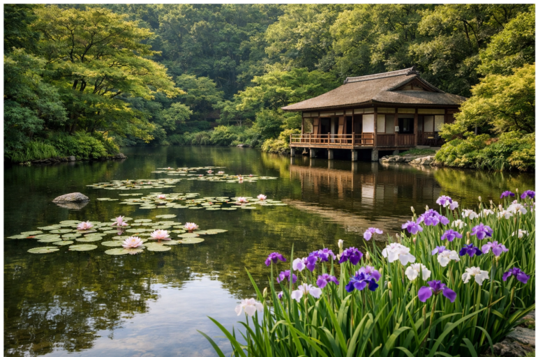 O jardim foi projetado com base nos gostos da Imperatriz Shōken e abriga um belo lago de íris que floresce no início do verão.